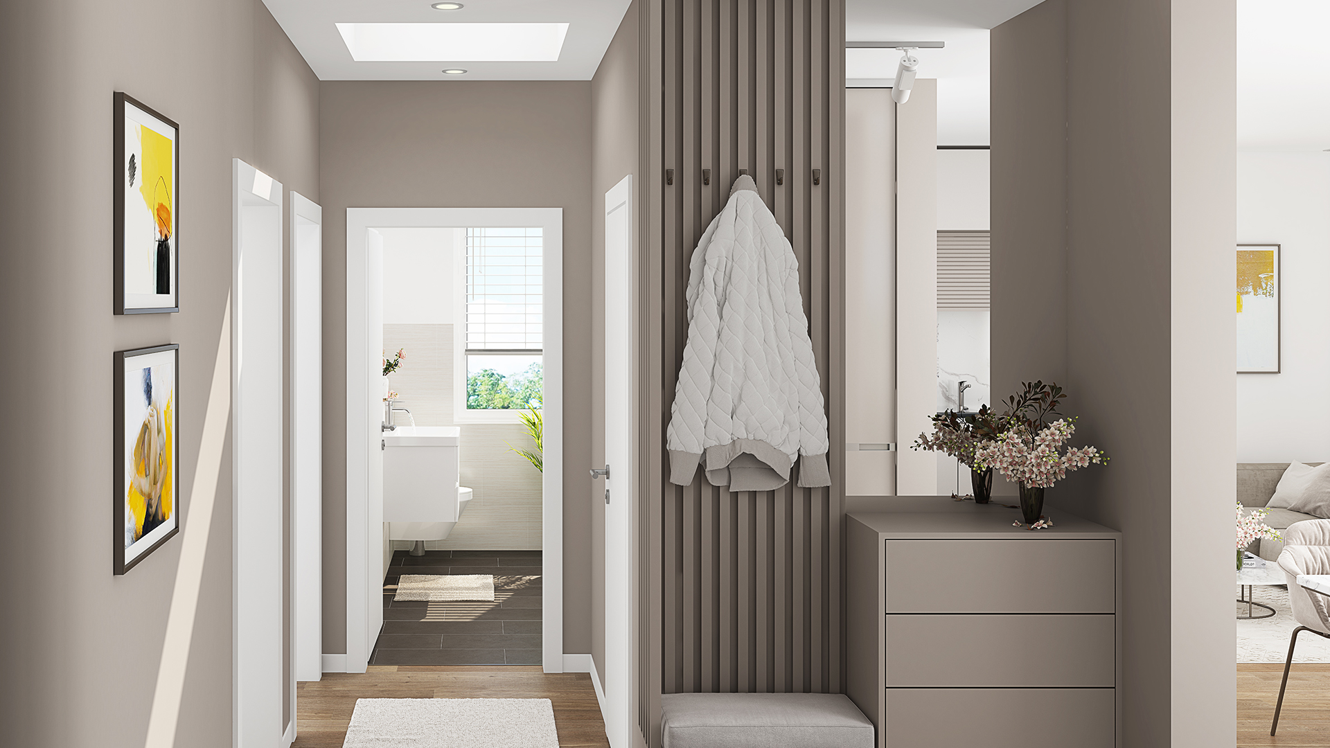 Die Innenausstattung der Wohnungen lässt keine Wünsche offen. Hochwertiger Design-Vinyl-Fußbodenbelag sorgt für eine moderne und pflegeleichte Oberfläche, während die strapazierfähigen Glasfasertapeten und die Kunststofffenster mit 3-fach-Verglasung für eine hohe Wohnqualität sorgen. Elektrische Rollläden und eine Fußbodenheizung gehören ebenso zur Standardausstattung wie eine moderne Videogegensprechanlage, die für zusätzliche Sicherheit sorgt.