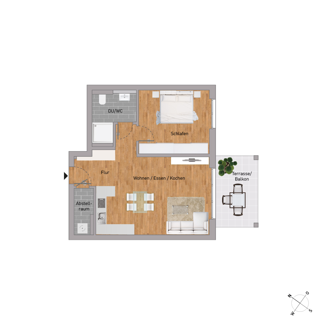 Ein Abstellraum, der ca. 3 m² umfasst, ist ideal für die Aufbewahrung Ihrer Haushaltsgeräte und bietet auch Platz für eine Waschmaschine. Der Flur, mit einer Größe von ca. 7 m², verbindet die Räume sinnvoll und sorgt für eine effiziente Nutzung der Wohnfläche.