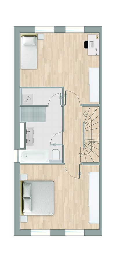 Im Dachgeschoss entstehen Räume, die sich dem Leben anpassen. Zwei gut geschnittene Zimmer bieten Platz für Kinder, Gäste oder konzentriertes Arbeiten. Licht und Ruhe geben der Etage einen eigenen Charakter.