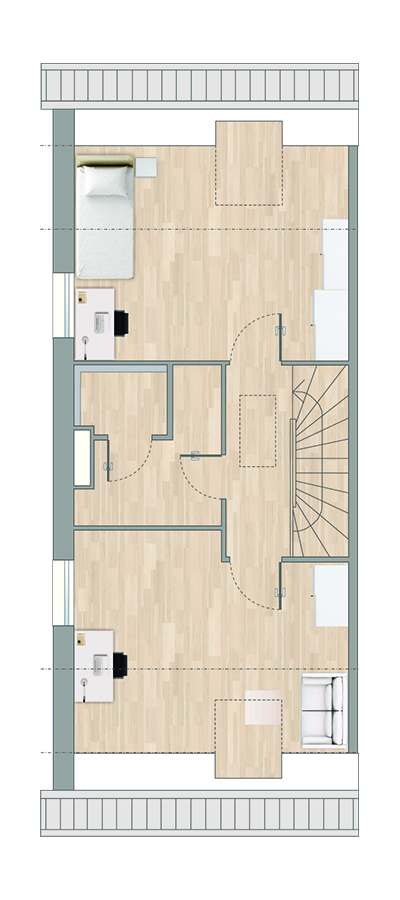 Im Dachgeschoss entstehen Räume, die sich dem Leben anpassen. Zwei gut geschnittene Zimmer bieten Platz für Kinder, Gäste oder konzentriertes Arbeiten. Licht und Ruhe geben der Etage einen eigenen Charakter.
