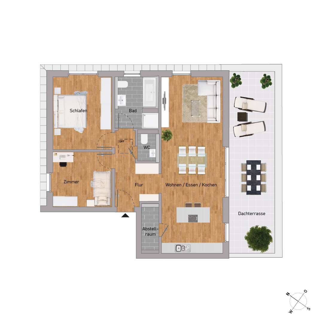 Ein besonderes Highlight ist die großzügige Dachterrasse, die mit ca. 14 m² zur Hälfte in die Wohnfläche einfließt. Hier können Sie die Sonne genießen und den Ausblick über das Quartier in Ruhe auf sich wirken lassen.