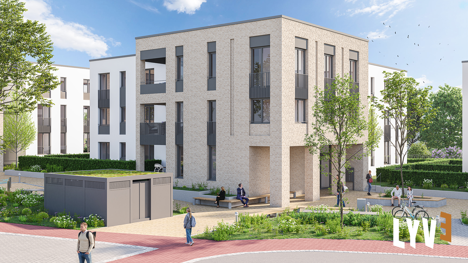 Die drei Häuser sind klar gegliedert und leicht versetzt angeordnet, wodurch großzügige Zwischenräume, Wege und Plätze entstehen. Die Erschließung erfolgt komfortabel über Aufzüge, barrierearme Zugänge und eine zentrale Tiefgarage, deren Zufahrt dezent auf der rückseitigen Grundstücksseite liegt. Durchdachte Wegeführungen verbinden die Eingänge mit den umliegenden Straßen und sorgen für kurze, gut erreichbare Wege im Alltag.