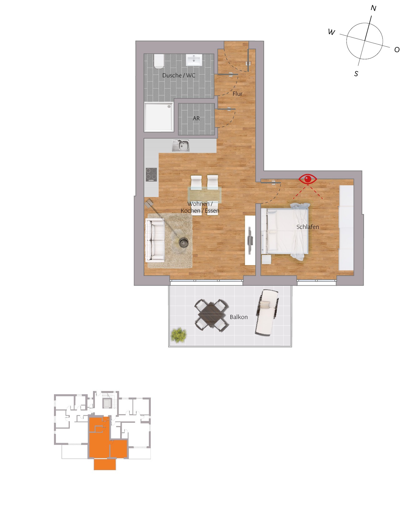Mit ca. 62 m² Wohnfläche und einem klaren, durchdachten Raumkonzept erleben Sie hier höchsten Wohnkomfort. Das großzügige Wohn-/Esszimmer mit offener Küche (26,07 m²) wird schnell zum Herzstück Ihrer Wohnung – ein Ort, der zum Entspannen, Kochen und Zusammensein einlädt. Das gut geschnittene Schlafzimmer (15,27 m²) verspricht erholsame Nächte, und der private Balkon (6,11 m²) bietet Ihnen Ihren persönlichen Rückzugsort unter freiem Himmel.