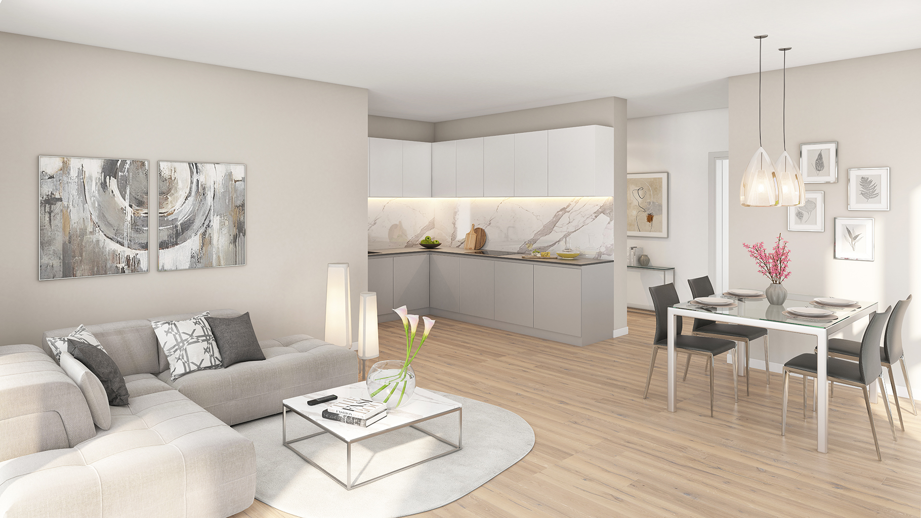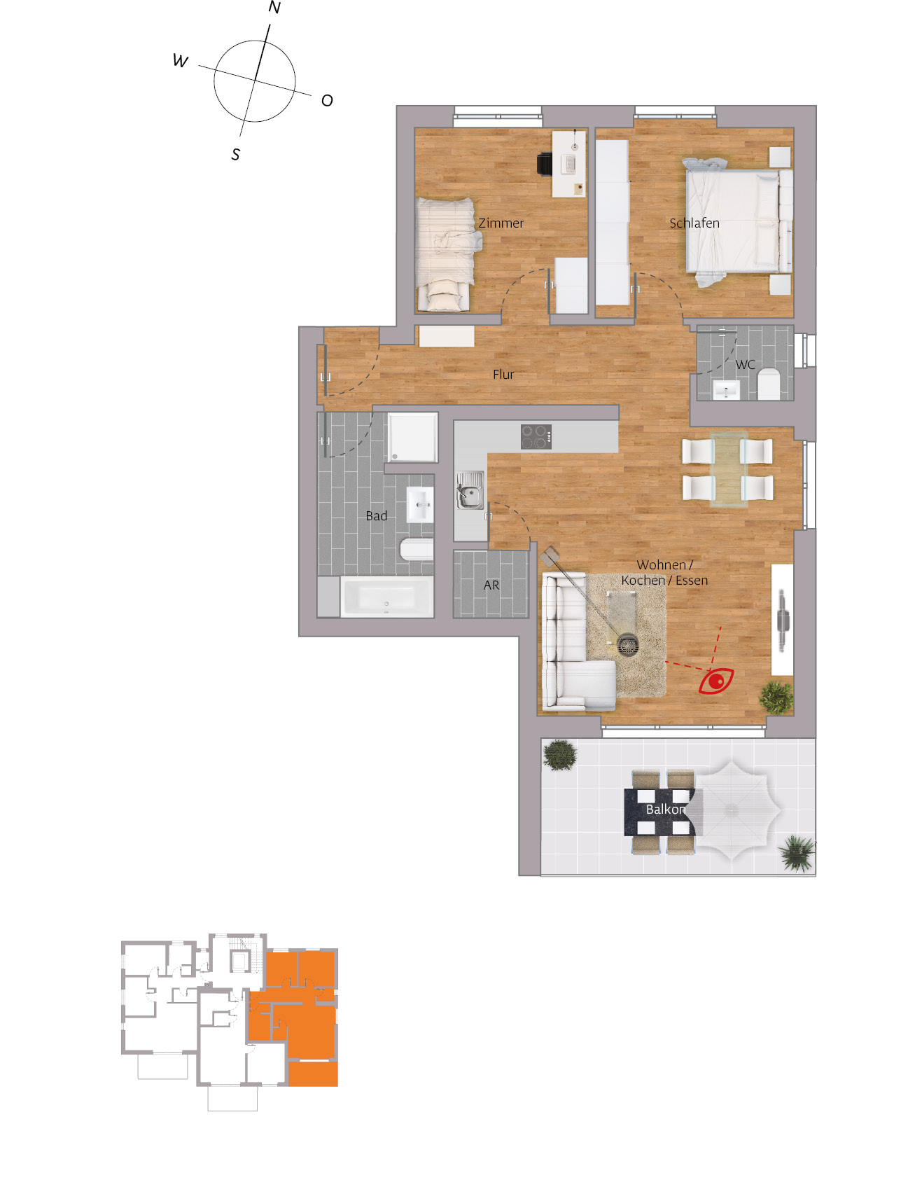 Der offene Wohn-/Essbereich mit Küche (29,05 m²) ist der Mittelpunkt des Wohnens: Ob Sie Gäste empfangen oder den Tag in Ruhe ausklingen lassen – hier findet das Leben statt. Zwei zusätzliche Zimmer (12,77 m² und 10,71 m²) bieten Raum für ein Schlafzimmer, Homeoffice oder Gästezimmer. Das moderne Bad (8,42 m²) und ein separates WC (2,43 m²) bringen Komfort in den Alltag. Ein Abstellraum (1,70 m²) und der Flur (9,59 m²) bieten zusätzlichen Stauraum, während der Balkon (6,25 m², anteilig) Platz für eine erholsame Auszeit im Freien schafft.